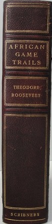 African Game Trails was released in 1910 (before he even returned from his safari) in seven formats by four publishers: Scribner's, Syndicate Publishing, Murray, and a German publisher. There are four Scribners editions: a two volume signed limited edition ($5,000+), a special edition bound in half leather with cloth covered boards ($400+ in very good or better condition), the trade edition in tan cloth with two gilt elephant heads on the front cover and tissue guards over Goodwin's prints, and the subscription edition printed by Conkey with more photographs and with a scene of elephants in a forest on the front cover. There is the Syndicate Publishing edition published under agreement with Scribners. It has an ornate scene on the front cover of Roosevelt shooting a lion off of a native and the Goodwin prints are in color. The British edition was published by Murray with a rhino on the cover. The German edition is not commonly seen. |